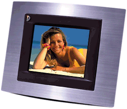 product, please contact us and we can provide you with a quotation on a special production run (minimum quantity: 1000 pieces). Digi-Frame accepts either SmartMedia and CompactFlash memory cards. With the included cable it can also store and display images received by e-mail or the internet from your PC or Macintosh. With Digi-Frame's easy-to-use graphic on-screen menu system, you can choose which of your stored images to display in up to ten different slide shows, each with its own pictures and settings. Choose from nine different transition effects, set the time between picture changes, add special effects, select random or user-defined order, and more!. Digi-Frame can be placed vertically or horizontally - the image rotates automatically when you turn it! |