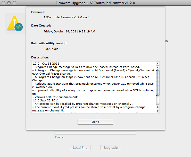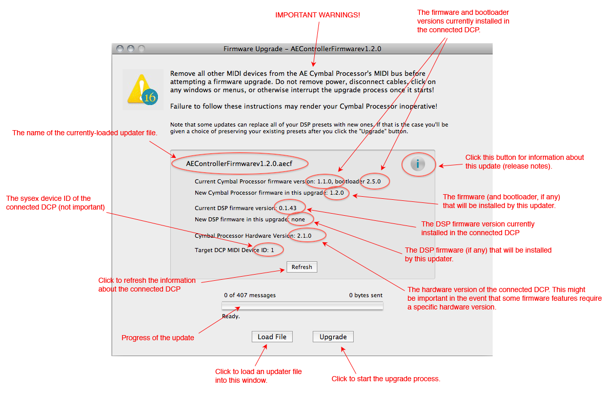 The Firmware Upgrade window opens whenever a firmware upgrade file (a Gen-16 file with a ".aecf" extension) is opened. Upgrade files can be opened automatically after being downloaded by the automatic update-checking feature, via the File menu (File > Open or File > Open recent), by double clicking the file on your desktop, or by dragging the file to the DCP Access Tool's icon in the Dock (Macintosh).