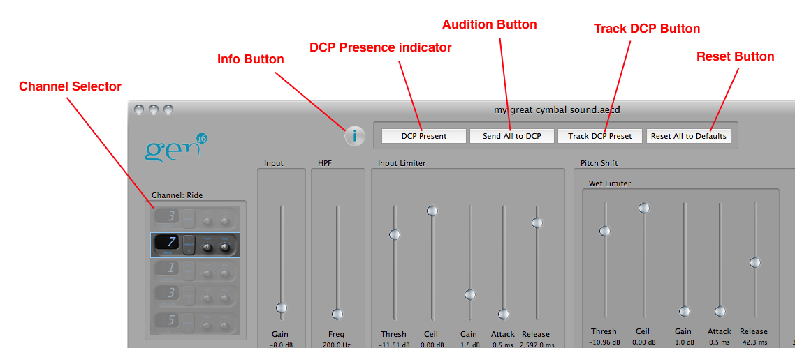 When Track DCP is off, it determines the "target" channel for any adjustments made to the DSP controls. For instance, if the Channel Selector is set to Ride, moving any of the DSP parameter sliders will affect the sound coming through the Ride channel and will not affect the sound of any other channels.