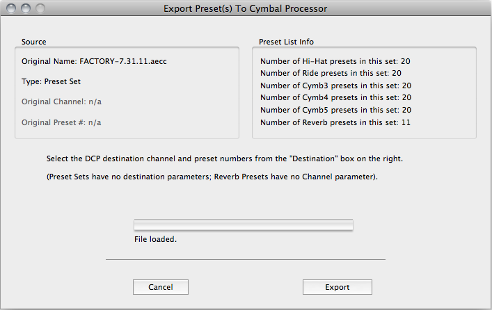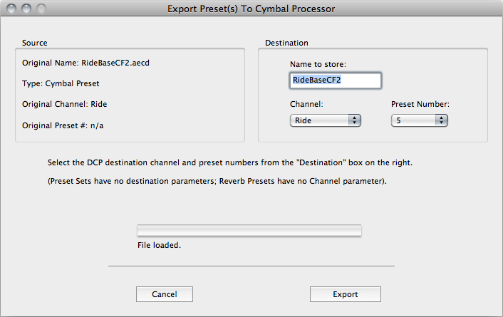 If you've loaded a cymbal or reverb preset (*.aecd or *.aecr file) into the Export window, its "Source" information is shown in the window - its name, type, and the cymbal channel and number for which it was originally designed. Prior to exporting the preset to your DCP, you can select its "destination" - which cymbal channel and which of that cymbal channel's existing presets is to be overwritten by the new preset (a cymbal or reverb preset cannot be "added" or "appended" to the currently-installed presets; it must overwrite an existing preset). Select the destination Channel and Preset Number from the pulldown menus in the "Destination" section. You can also assign a name to the preset, of up to 16 characters. While this name cannot be displayed by the DCP, it is stored in the DCP with the preset's other data and will be retrieved when the preset is imported from the DCP.
