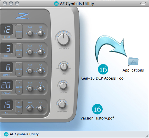 Drag the Gen-16 DCP Access Tool application to the alias of your Applications folder that's provided in the window, or to any other location on your hard drive. After you've copied the application (and Version History if desired) to your hard drive, the disk image can be unmounted and the "aecu.dmg" file discarded.