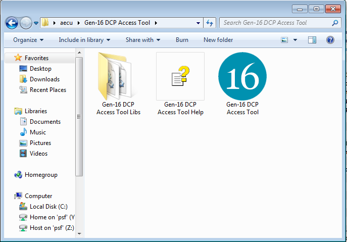 Un-zip the downloaded file "aecu.zip". It will decompress into a folder called "aecu", which will contain a version history PDF file and another folder called "Gen-16 DCP Access Tool". Drag the "Gen-16 DCP Access Tool" folder to your Program Files directory or other location on your hard drive. The Gen-16 DCP Access Tool folder contains the Gen-16 DCP Access Tool.exe executable file, a folder called "Gen-16 DCP Access Tool Libs", and a file called "Gen-16 DCP Access Tool.chm". The "Gen-16 DCP Access Tool Libs" and the "Gen-16 DCP Access Tool.chm" file must reside in the same folder as the .exe file. Here's what the Gen-16 DCP Access Tool folder should look like under Windows 7: